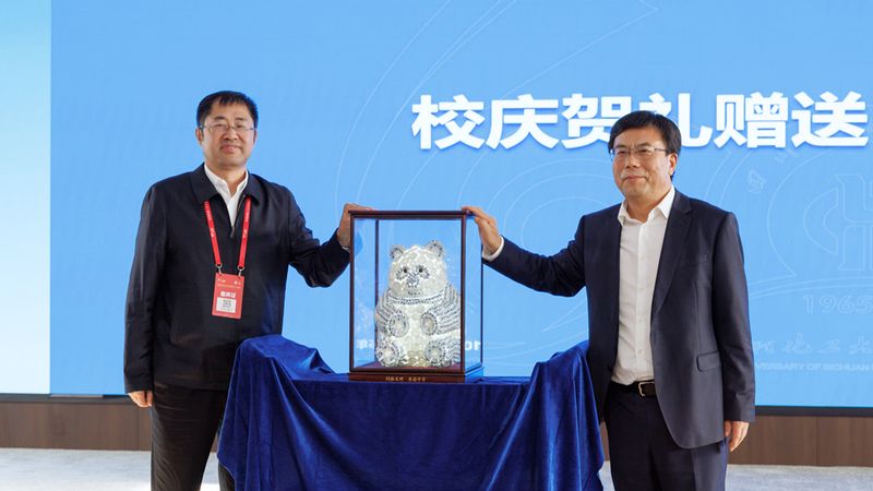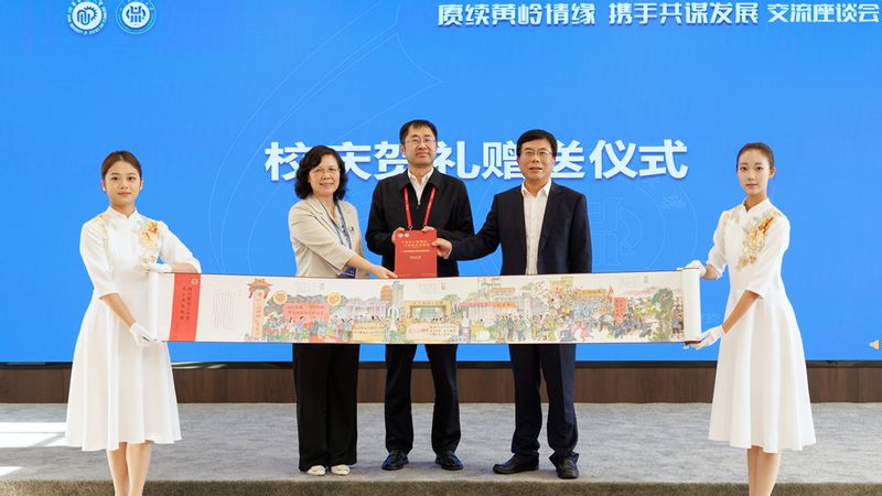 会上,蒋传海代表我校赠送校庆贺礼——由非遗连环画传承人罗希贤先生领衔创作、历时半年精心打造的6.52米长《千里初心映蜀山 六秩携手赴新程——“652工程”历史长卷》及配套画册。四川轻化工大学回赠了由其校友、自贡彩灯非遗传承人万松涛制作的瓷器手工捆扎技艺灯品国宝熊猫。它们不仅是两校友谊的象征,更是两校在服务国家战略和区域高质量发展的新征程上携手同行的历史见证。