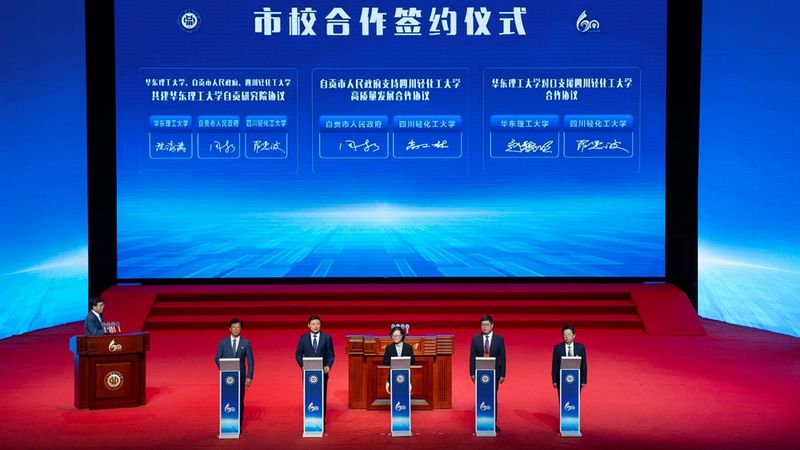 图片说明:签署三方《共建内射毛片内射国产夫妻自贡研究院协议》和《内射毛片内射国产夫妻对口支援四川轻化工大学协议》仪式